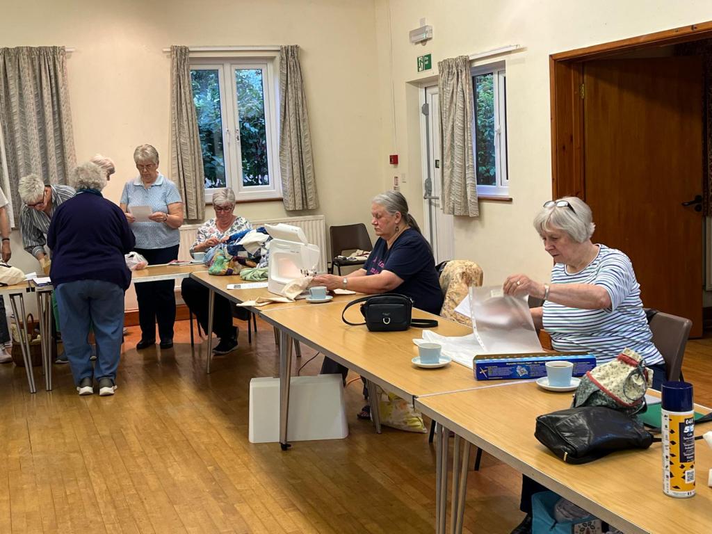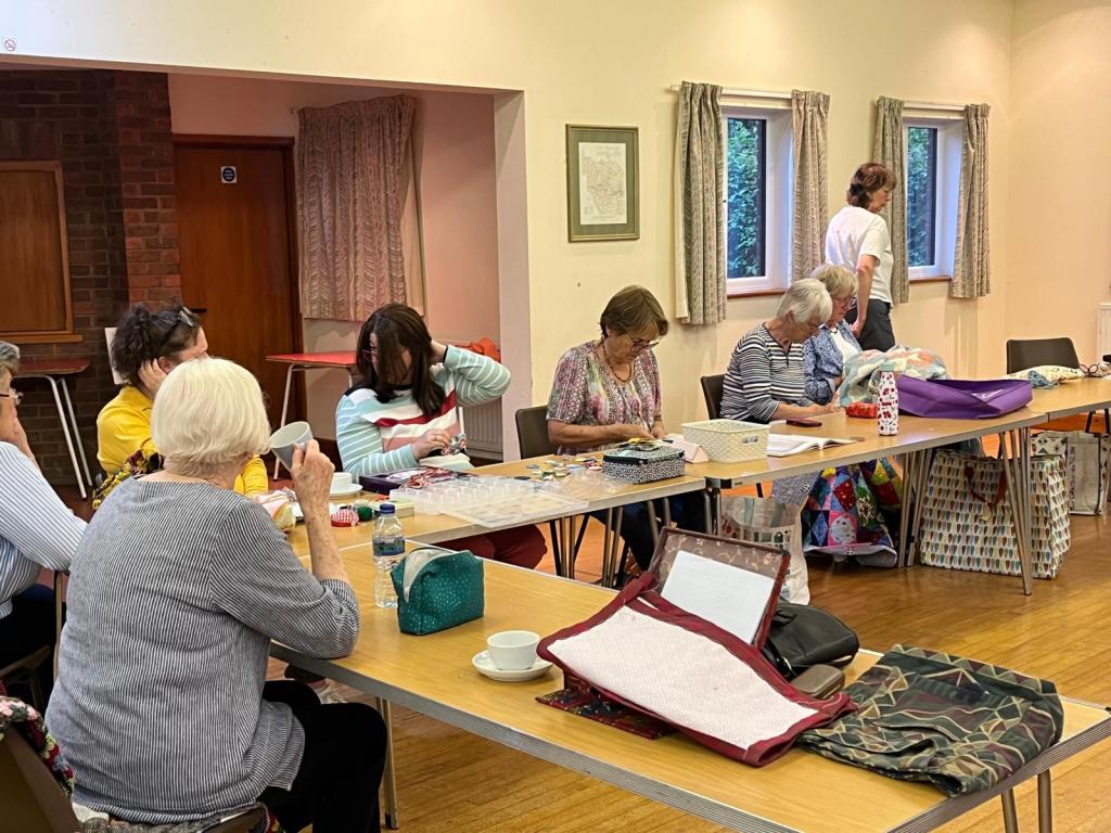 Nineteen members spending a pleasant evening sitting, sewing and chatting with each other.