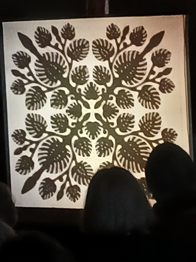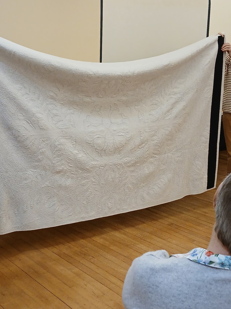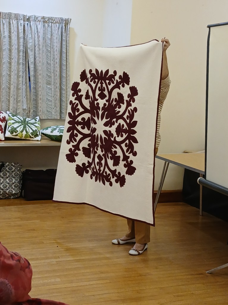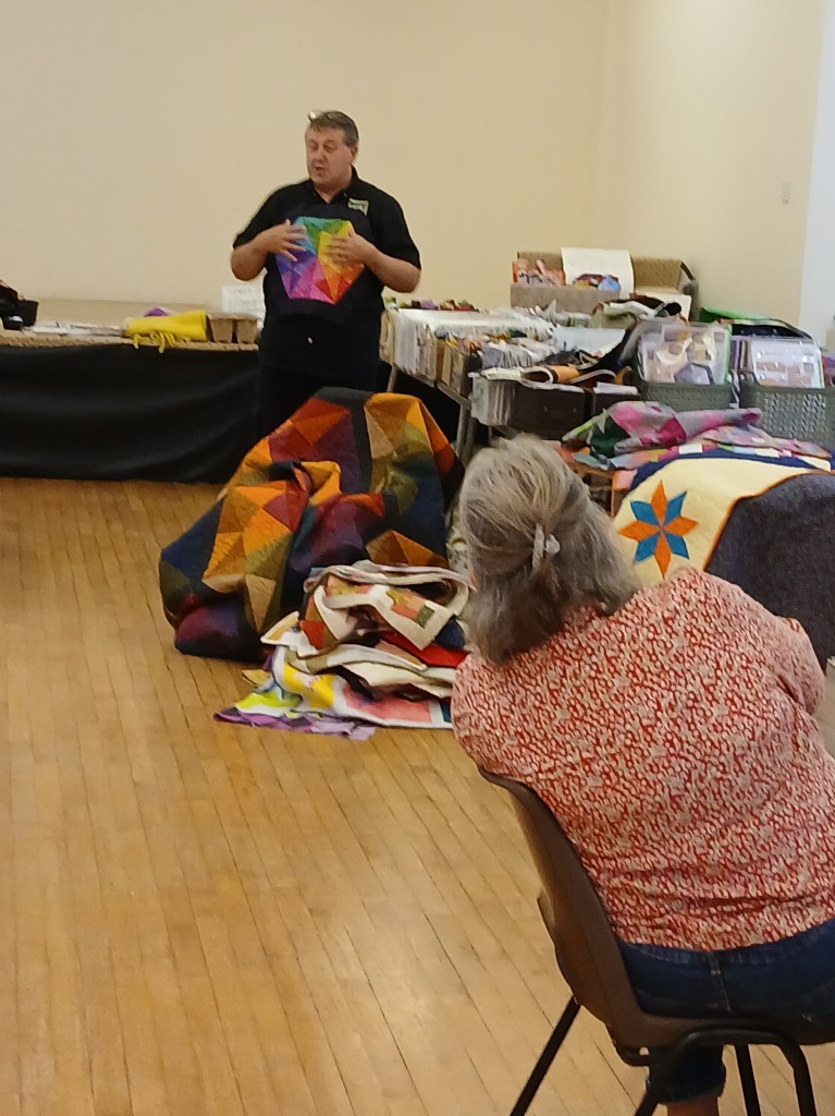 Andy gave us a detailed explanation of the Hexagon ruler we would be using and showed us the different patterns that could be made. We were then shown how to use the ruler to cut our fabric in order to make a block. Amidst much chatter and discussion members moved to their individual spaces to begin their project and helped each other, some of us taking a little longer to get our heads around what we had been shown. By lunch time most members had been able to finish their first block, whilst others had made several and were well on their way to a finished project. As members enjoyed their lunch Andy explained how he had developed his acrylic templates to help make traditional blocks more easily. With the help of Jo they then showed us a wide array of quilts that had been made with the aid of his various templates. Everyone agreed they had thoroughly enjoyed the day and many said they would like Andy to return and run another workshop.