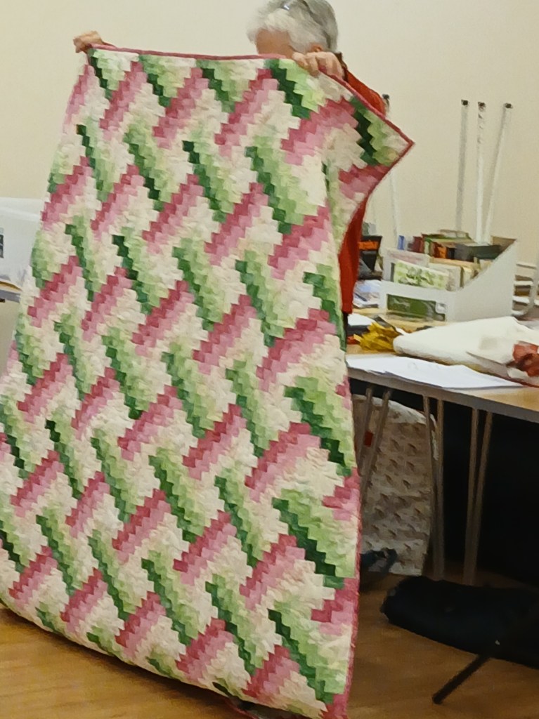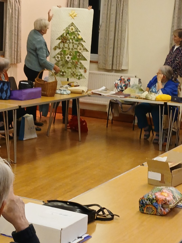 The evening started with Alyson showing us her quilt and reminding us we still had time to make one for Christmas. She said she hoped to see a forest of Christmas Trees displayed at our Exhibition next year. Val showed her quilt, with patchwork ornaments, which she had adapted to hang on a door. Chris had been busy and showed us one of the two quilts she had made.