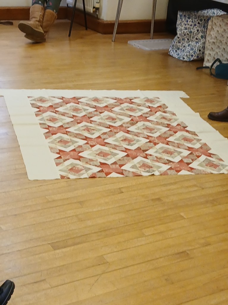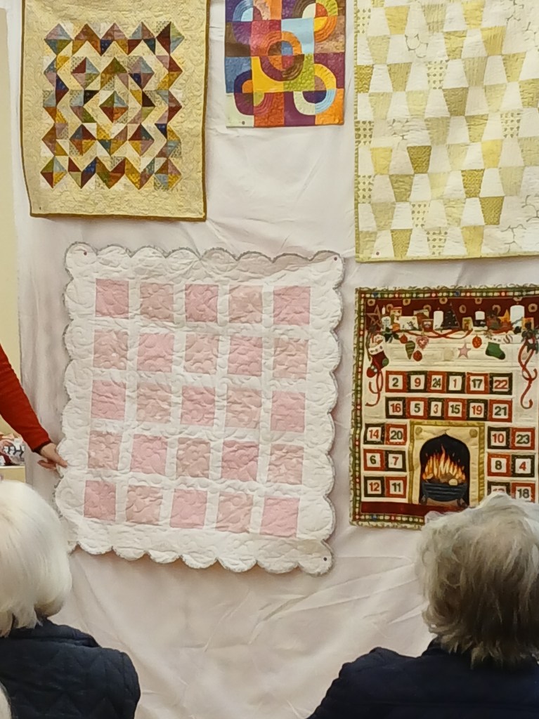 Frances had brought along a selection of smaller quilts which she used to demonstrate various options for free motion quilting. She explained that when you were ready to quilt you needed to decide whether you wished to enhance the patchwork or draw attention to the quilting pattern. She explained that free motion quilting, which many of us found daunting, could be helped by practising a design with pen and paper or a whiteboard in order to imprint the design on our brain before we started sewing on our actual quilt. Then using her whiteboard she demonstrated a method for working a feather design. Various samples of fabric were passed around to demonstrate the difference between the cotton fabric used for piecing and the extra wide backing fabrics. She had brought along several quilts which were also passed around enabling members to take a closer look at the quilting patterns. Everyone agreed it had been a very enjoyable and interesting evening and Frances was thanked for all the useful hints and tips she had given us. I am sure that with all the information Frances had given us it would enable many of us to improve our future free motion quilting skills.