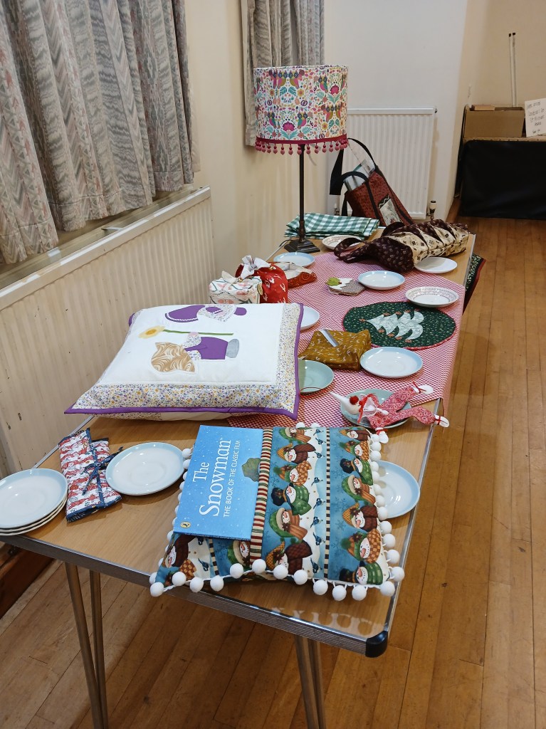 The last meeting for the year was the Annual Christmas Party, when 20 members arrived promptly, armed with delicious plates of food to share. Tables were set up and arranged quickly then everyone was treated to a glass of warming mulled wine or soft drink. The evening’s festivities started with the Charity Game, kindly organised by Carol. With much laughter some very interesting presents were swapped around the group. As members chatted and enjoyed the refreshments a selection of clever and attractive Christmas Cards, made by members, were exchanged. The Fabric Challenge attracted a varied selection of items for the 1p vote, which was won by Carol for her book cushion. As the evening came to a close we said farewell to one of our members, Deborah Jarman, who was moving away from the area. It was suggested that at some time in the future we might be able to twin with the new quilting group she had identified. Everyone agreed they had enjoyed the evening and all that was left for us to do was tidy up before we went home. Thanks go to everyone who helped with the washing up and stacking the tables and chairs away.