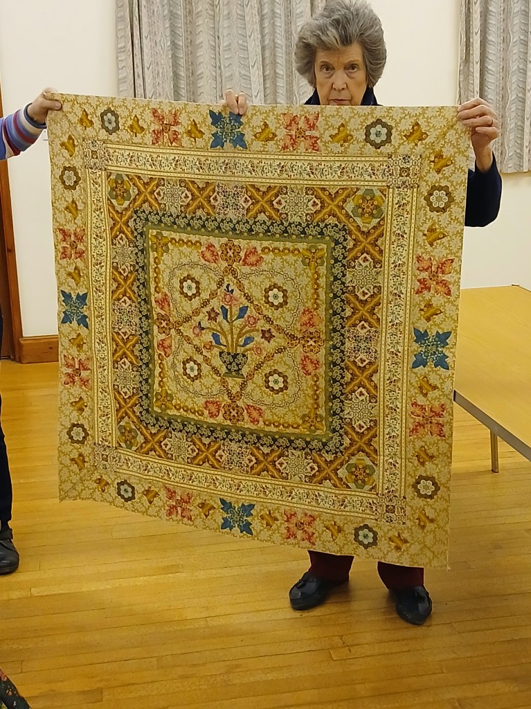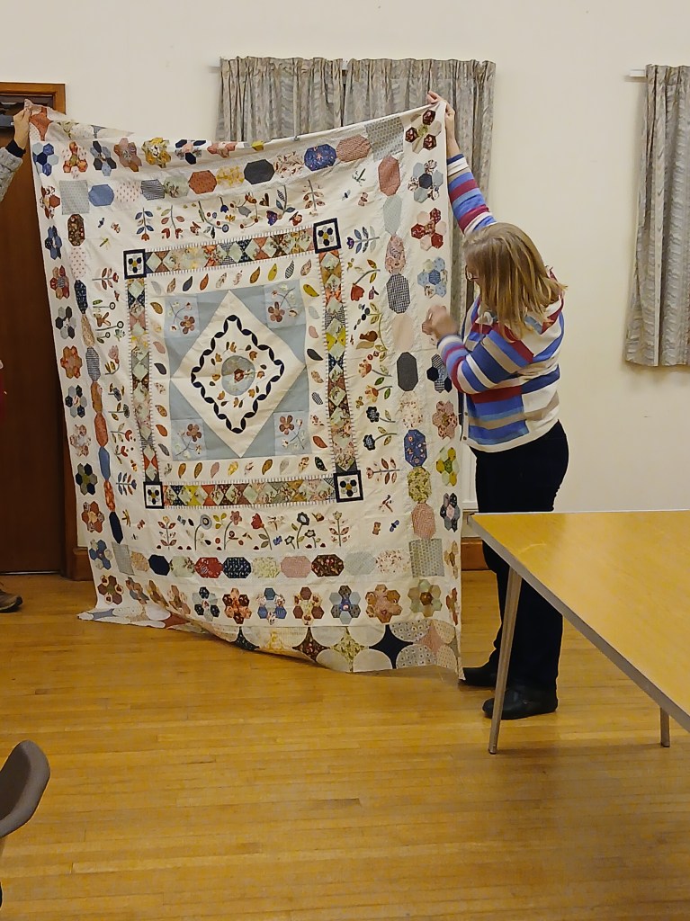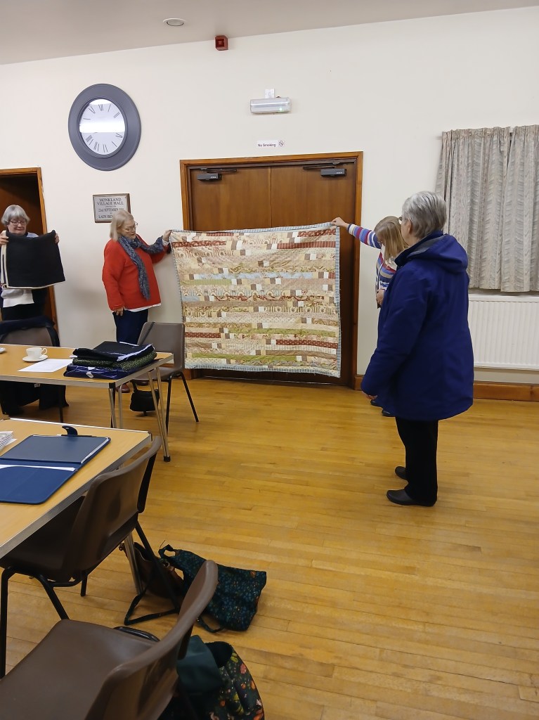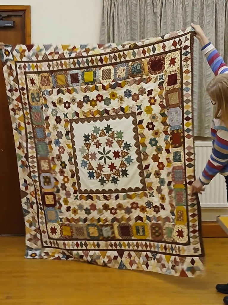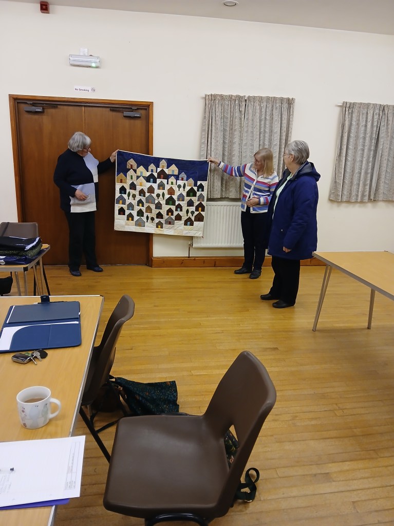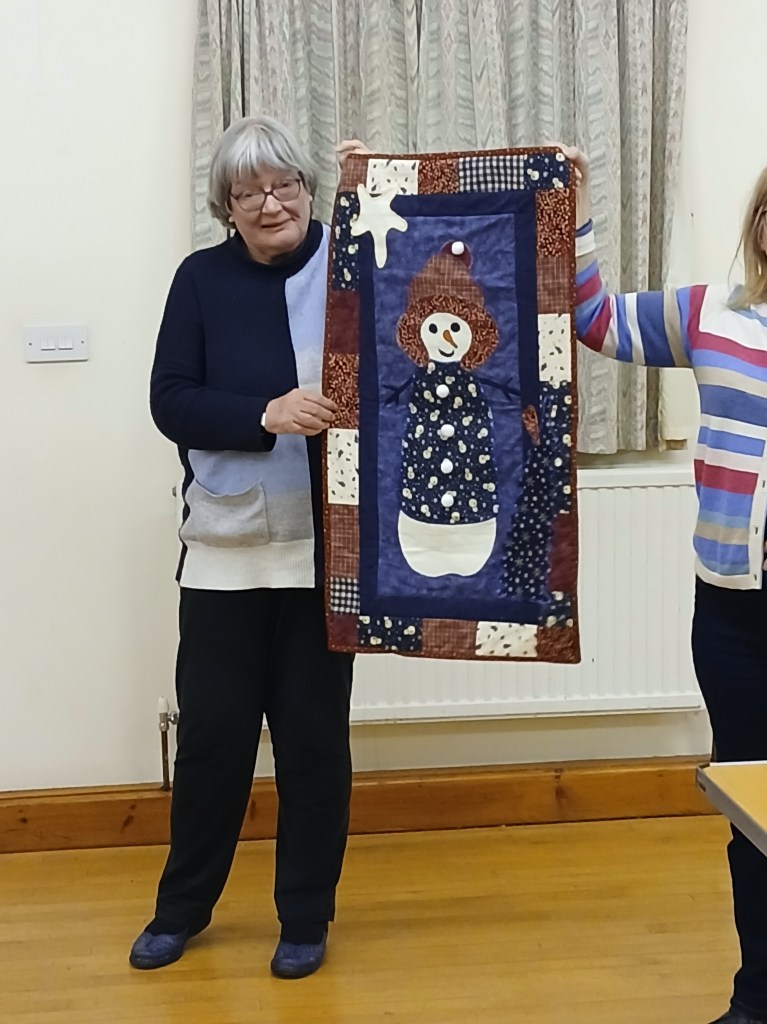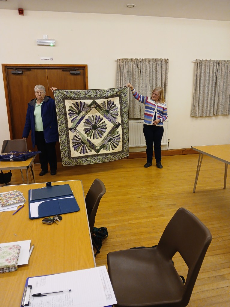 A bright sunny day encouraged members to brave the cold for the first meeting of the New Year.  As members arrived, the hall soon buzzed with chatter and laughter whilst we all worked on our individual projects and enjoyed some lovely cakes and biscuits that had been brought for us to share.  We also took the opportunity to look at a selection of Maggie’s fabric that Kate had kindly brought along.  At the end of a very pleasant and productive day members went home happily laden with quilts to finish or a collection of Maggie’s fabrics to add to their stash.