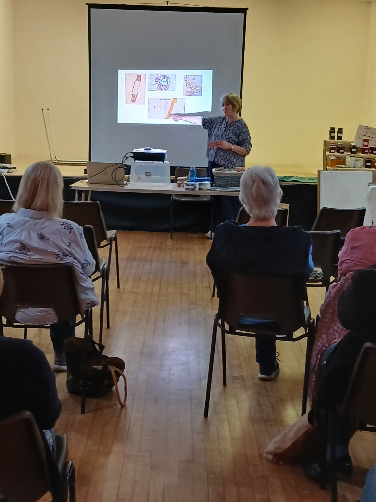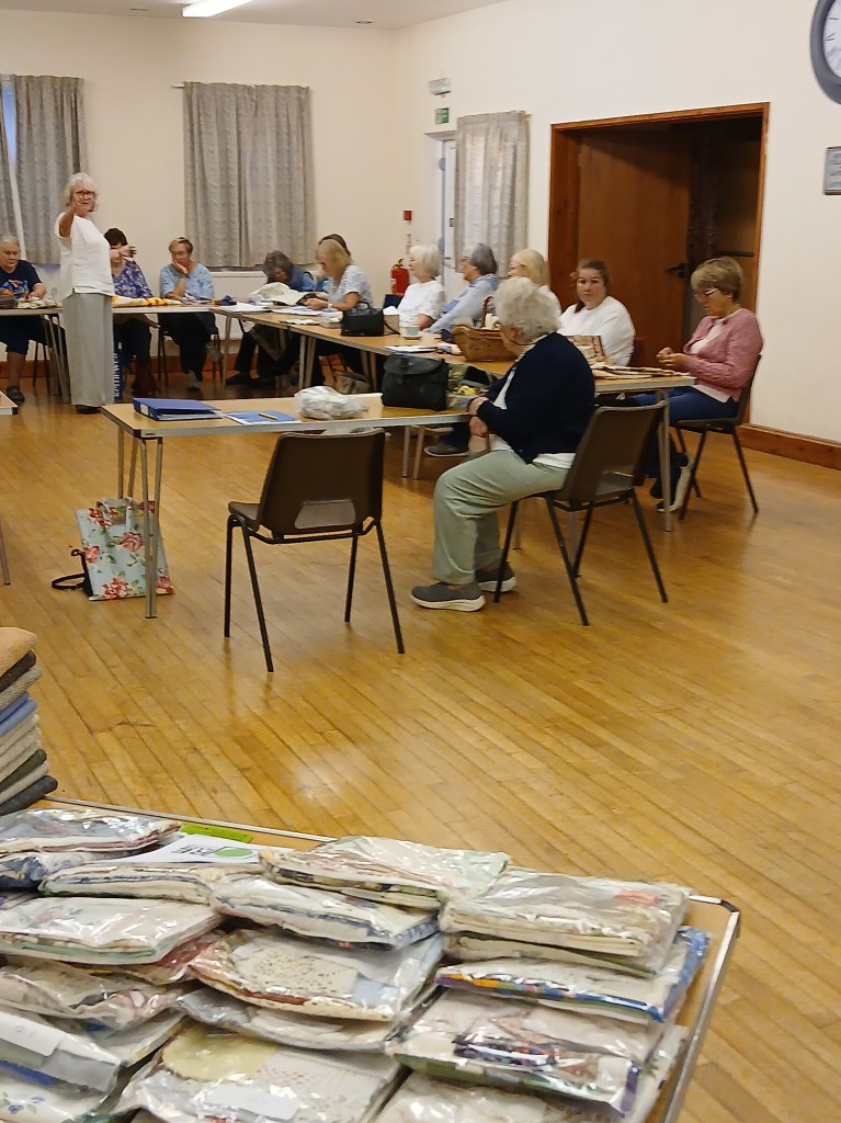 Andy gave us a detailed explanation of the Hexagon ruler we would be using and showed us the different patterns that could be made. We were then shown how to use the ruler to cut our fabric in order to make a block. Amidst much chatter and discussion members moved to their individual spaces to begin their project and helped each other, some of us taking a little longer to get our heads around what we had been shown. By lunch time most members had been able to finish their first block, whilst others had made several and were well on their way to a finished project. As members enjoyed their lunch Andy explained how he had developed his acrylic templates to help make traditional blocks more easily. With the help of Jo they then showed us a wide array of quilts that had been made with the aid of his various templates. Everyone agreed they had thoroughly enjoyed the day and many said they would like Andy to return and run another workshop.